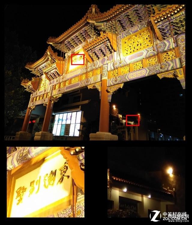 第一张样张中可以看到麦芒5对于天空的蓝色还原准确,取图片中心位置和边缘位置分别放大处理,可见解析力均十分出色;第二张为同场景的夜景样张,建筑物曝光充足,天空较为纯净噪点少,另一表现出色的地方是画面中心的路灯炫光控制出色。