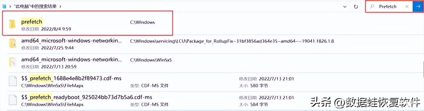 Prefetch文件夹是电脑已访问的信息。进入此电脑,在右上角搜索框输入“Prefetch”,或者快捷键Ctrl+F输入“Prefetch”快速查找。