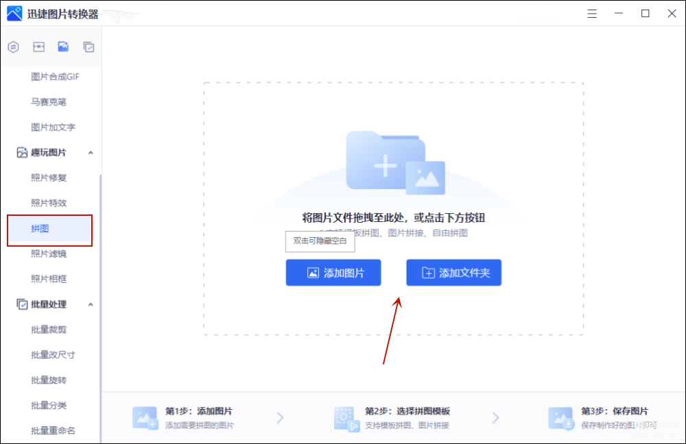 1.运行该软件,打开后选择【趣玩图片】中的拼图功能,然后按照图中的提示上传需要拼接的图片文件。