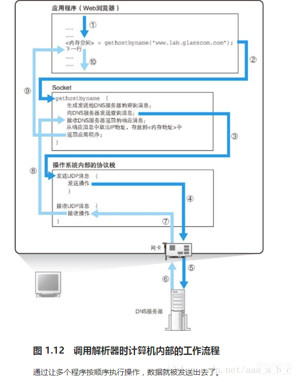 当控制流程转入解析器,解析器生成需要发送给DNS服务器的查询消息,然后委托给操作系统内部的协议栈来执行,(解析器本身不具备网络收发数据的功能)。协议栈执行发送消息的操作,通过网卡将消息发送给DNS服务器。如果DNS服务器找到该服务器,则会将IP地址写入响应消息返回给客户端,然后再经过协议栈传递给解析器,最后经解析器取出消息取出IP地址,传给应用程序。至此,完成了向DNS服务器查询IP地址的任务。