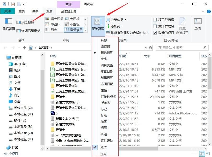 步骤2:打击回收站管理界面以后,如果回收站文件过多,在查看选项下是可以按文件类型、时间、大小等进行筛选找到需要还原的文件。
