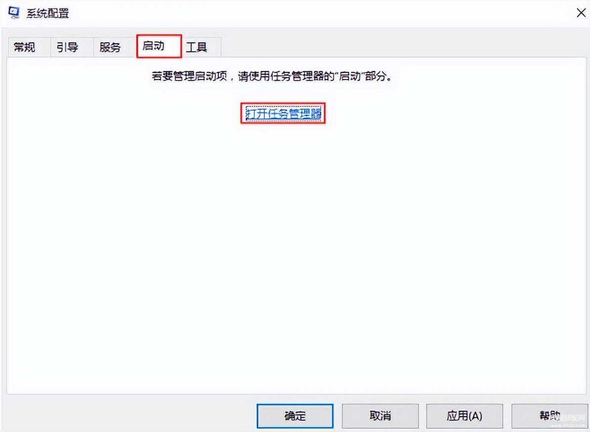 3、切换到“启动”栏,点击打开任务管理器,点击启动项,单击禁用,点击确定按钮,如下图所示: