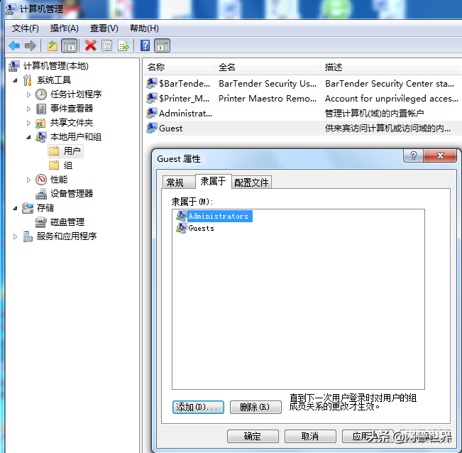 Guests属性里面,隶属于有一个Administrators组,我一下子看蒙了,怎么会有种情况,可能是他自己乱设置搞上去的,这种问题我还是头一回见到。