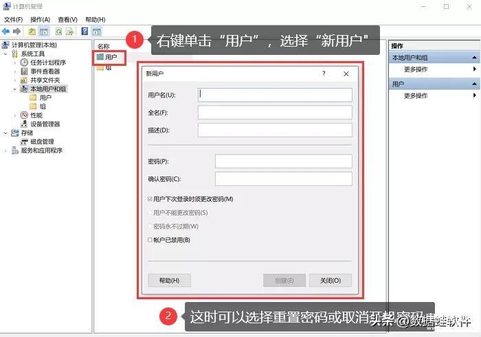 步骤3:右键单击【用户】,选择【新用户】。再选择【设置密码】,这时可以选择重置密码或者取消开机密码。