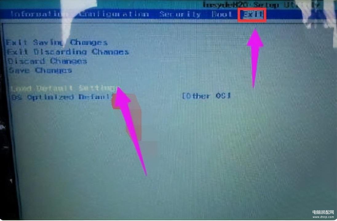 1、 快速按下快捷键进入bios界面,切换至Exit,将OS optimized Defaults默认Win8 64bit设置为Other OS