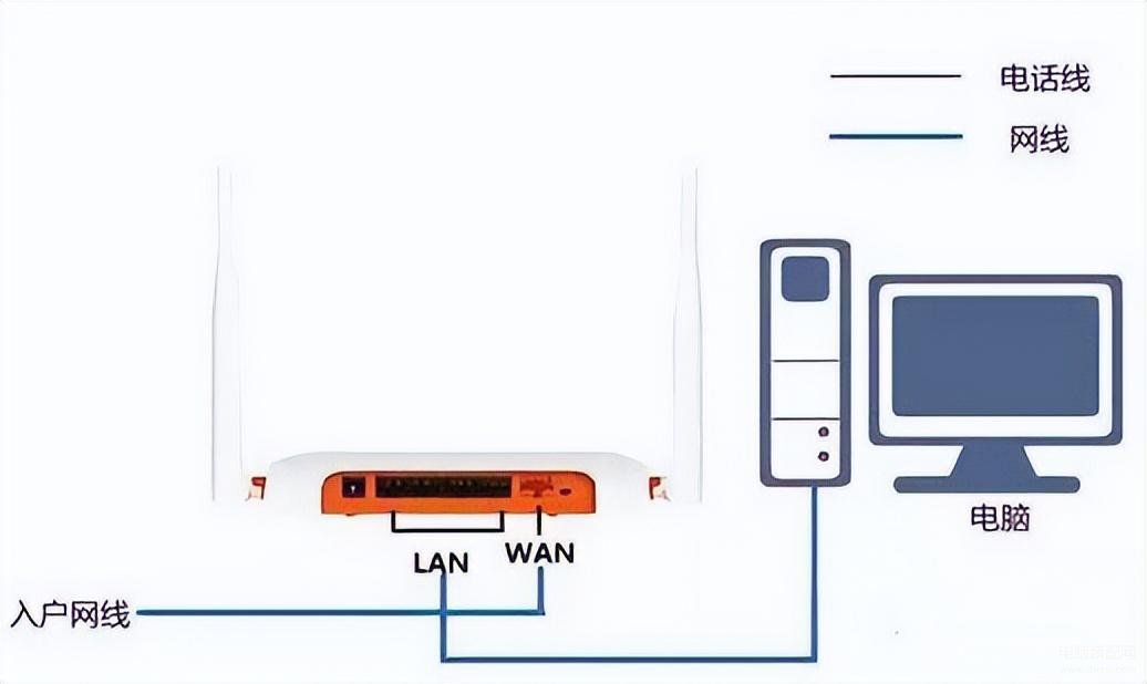 早期宽带都是通过电话线入户的,不过现在这种接入方式使用较少,做个简单的介绍:利用电话线入户连接调制解调器(猫),用网线连接猫和路由器WAN口,路由器LAN口正常连接电脑设备。