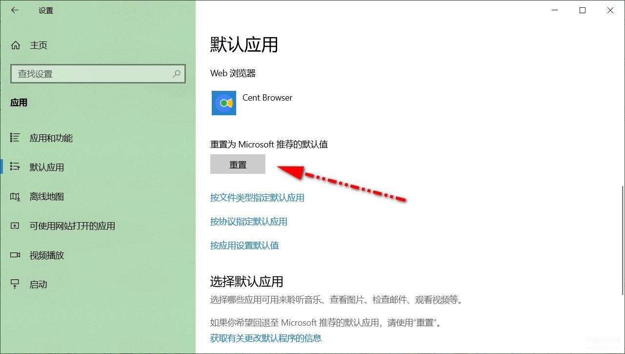 请转到“设置 - >应用 - >默认应用”,然后,向下滚动默认应用列表,直到找到“重置”按钮。