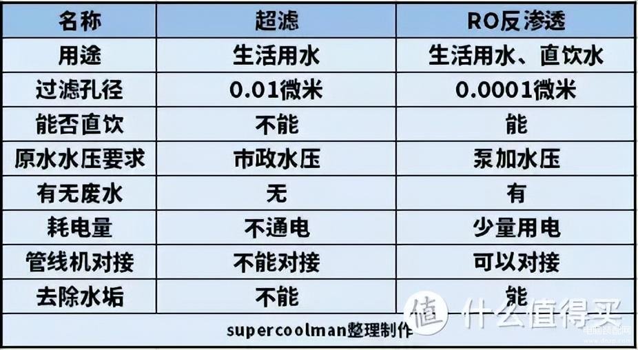 净水器的工作原理就是通过不同规格的滤芯对水进行过滤,按照过滤精度可分为微滤、超滤、纳滤、反渗透,其中:微滤、超滤、纳滤过滤后的水叫做净水,一般作为厨房用水,用来洗菜、做饭,但达不到直接饮用的标准,因为三者中最小过滤精度的超滤膜也只有0.01微米,无法彻底过滤掉重金属、有机污染物;RO反渗透过滤后的水叫做纯水,RO膜的过滤精度为0.0001微米,基本上可以将水中其他杂质全部滤除,可以直接饮用。我整理了常见的超滤、反渗透净水器之间的区别: