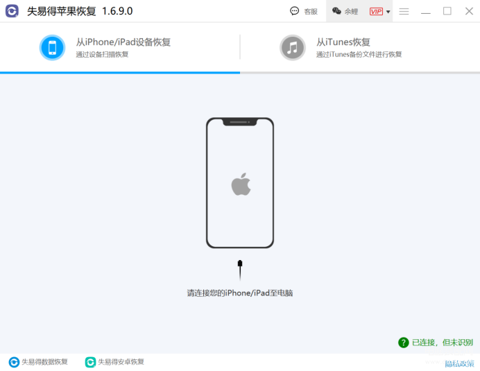 第一步:打开软件“失易得苹果恢复”,用USB数据线连接iphone/ipad和电脑,注意请尽量使用标配的USB数据线,劣质的数据线会导致连接不稳定。