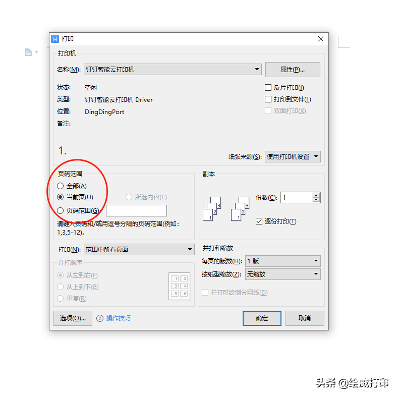 用户在点击打印对话框时,将页码范围设置中默认的“全部”,