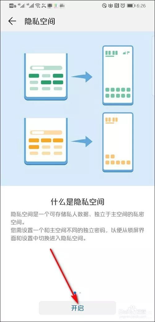 页面跳转到隐私空间设置界面,【开启】显示灰色图标时,就说明隐私空间设置好了。