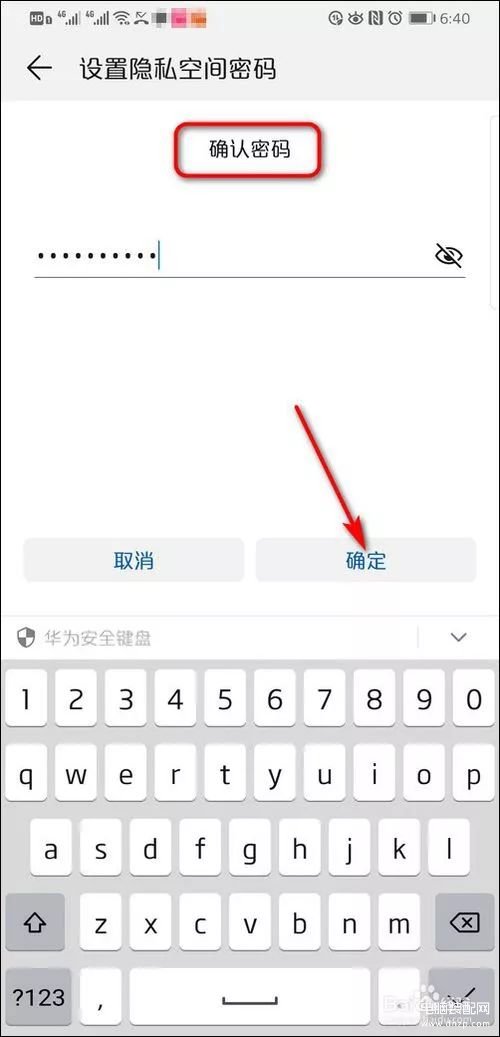 7、页面弹出【确认密码】,再次输入隐私空间的密码,点击【确定】;