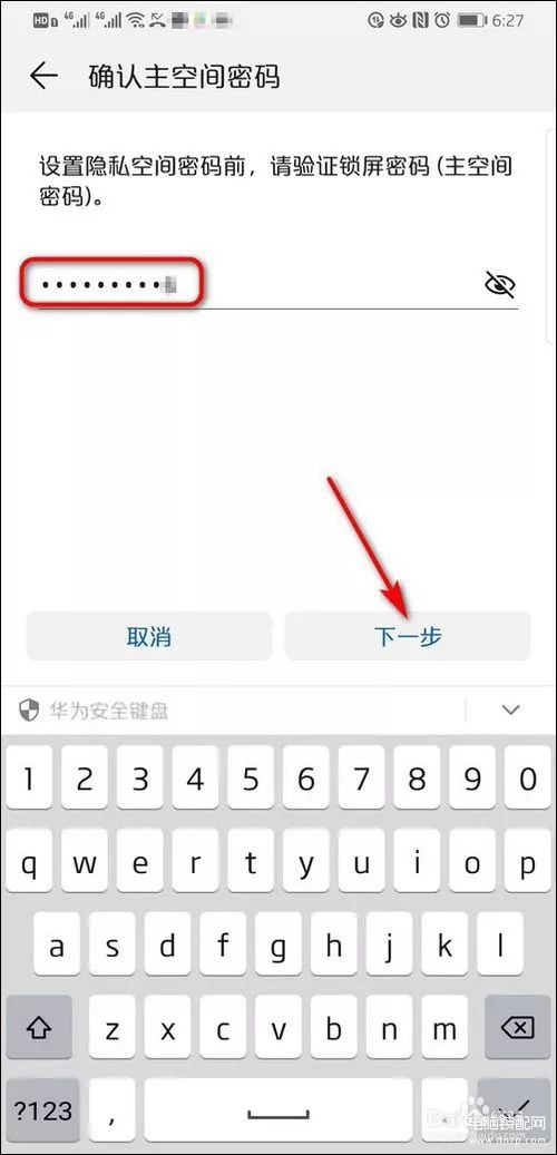 5、开启隐私空间前,需面确认主空间密码,输入【主空间的密码】,然后点击【下一步】;