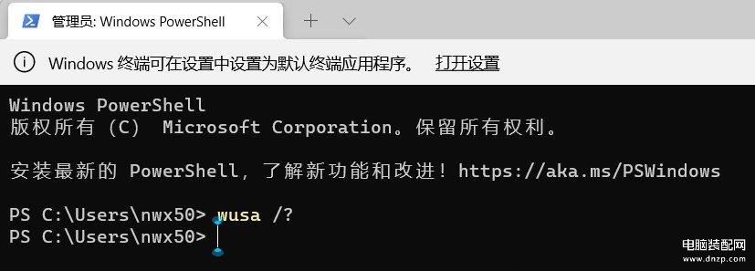 2、管理员: Windows powershell窗口,输入【wusa /?】命令,并按回车;