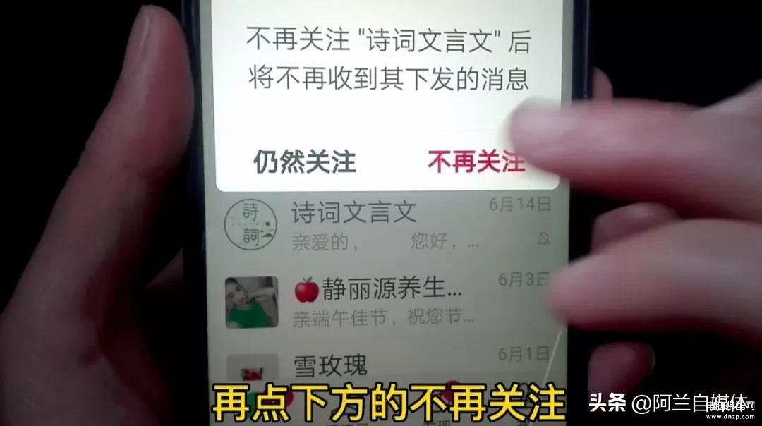 然后我们想关闭其他的订阅号消息,再次打开订阅号消息,再次打开三条横杠,在这里还有一个更快的方法,比如说这个订阅号我不需要了,我们用手指把它长按两秒,注意看下方出来了一个“不再关注”,我们把它点一下,然后再点下方的“不再关注”,那这个订阅号消息立刻也就取消关注了,这种方法更快捷,其他的订阅号消息大家一一操作就OK了。