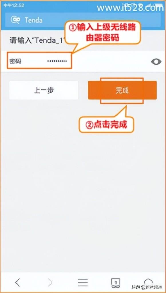 在浏览器中输入上级路由器密码,点击完成。如下图:
