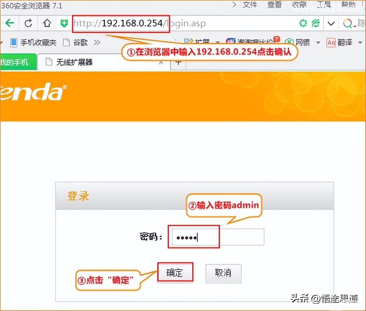 在浏览器中输入:192.168.0.254(或者输入re.tendacn.com) 按回车键——>在跳转的页面中输入密码 “admin” ——>点击“确定”,如下图: