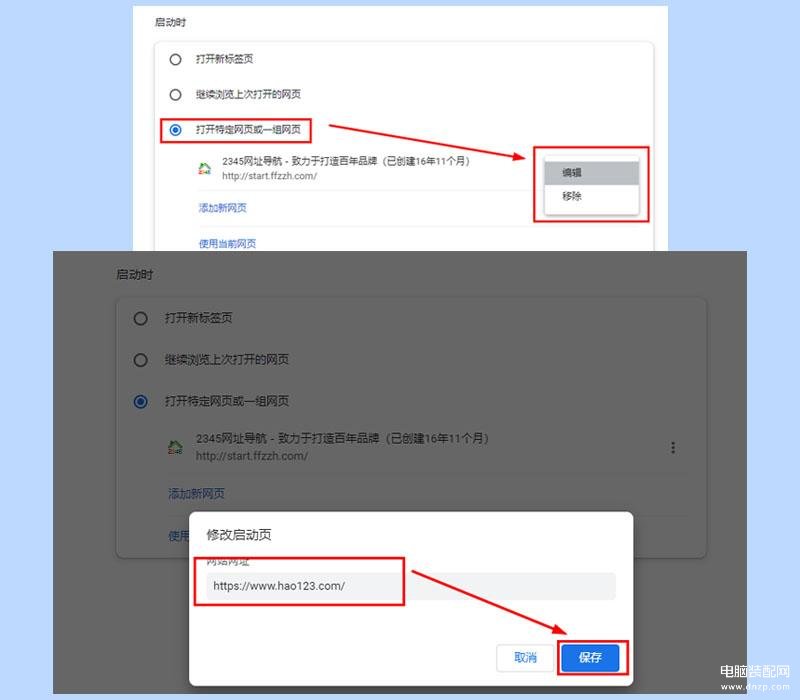 2、在打开设置页面中,点击启动时,这时候可以看到被篡改的网址,点击选择【打开特定网页或一组网页】后面的三个点,再点击【编辑】,我们将这个网址改成自己想要设置的主页网址,最后点击保存即可。