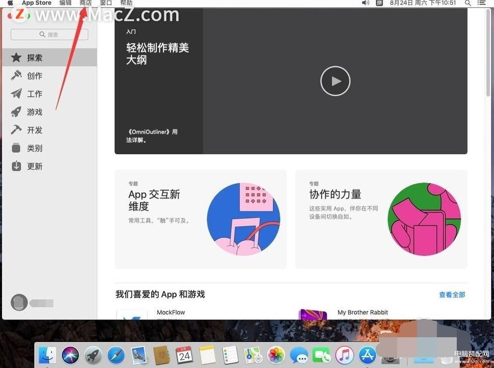 4.打开App Store后,点击顶部工具栏上的“商店”