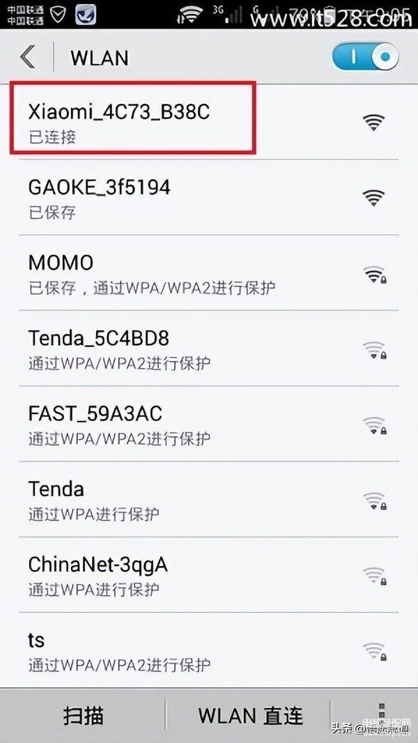 2、打开手机上的WLAN功能,搜索连接到小米路由器的无线信号,如下所示