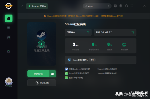 并且我们在Steam中挑选好游戏之后也可以用奇游对此游戏进行加速,这样可以减少在游戏过程中的闪退,掉线等等的问题。如果遇到一些登录不了的现象,大家也可以使用加速界面中的steam登录问题修复小工具。
