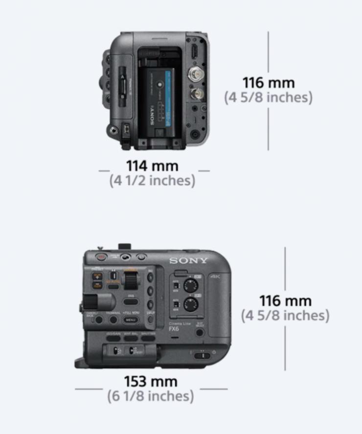 FX6单机身自重890克,只比FS5 Mark II(机身)重60克,比α7S III机身重276克。FX6机身长153mm(6.02″),高116mm(4.56″)。