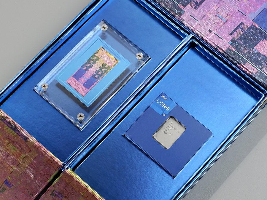 打开CPU套盒,可见一颗酷睿i7-13700处理器,以及一件透明桌摆。这件桌摆展示的是第13代酷睿台式机处理器的架构图。