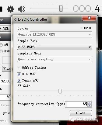 点击软件左上角的齿轮图标,并将下面的"Frequency correction"修改为大致的偏移量,并点击Close回到频谱窗口,再次发射并查看差距,不断重复这个过程,直到频率被修正到正确的位置上去。