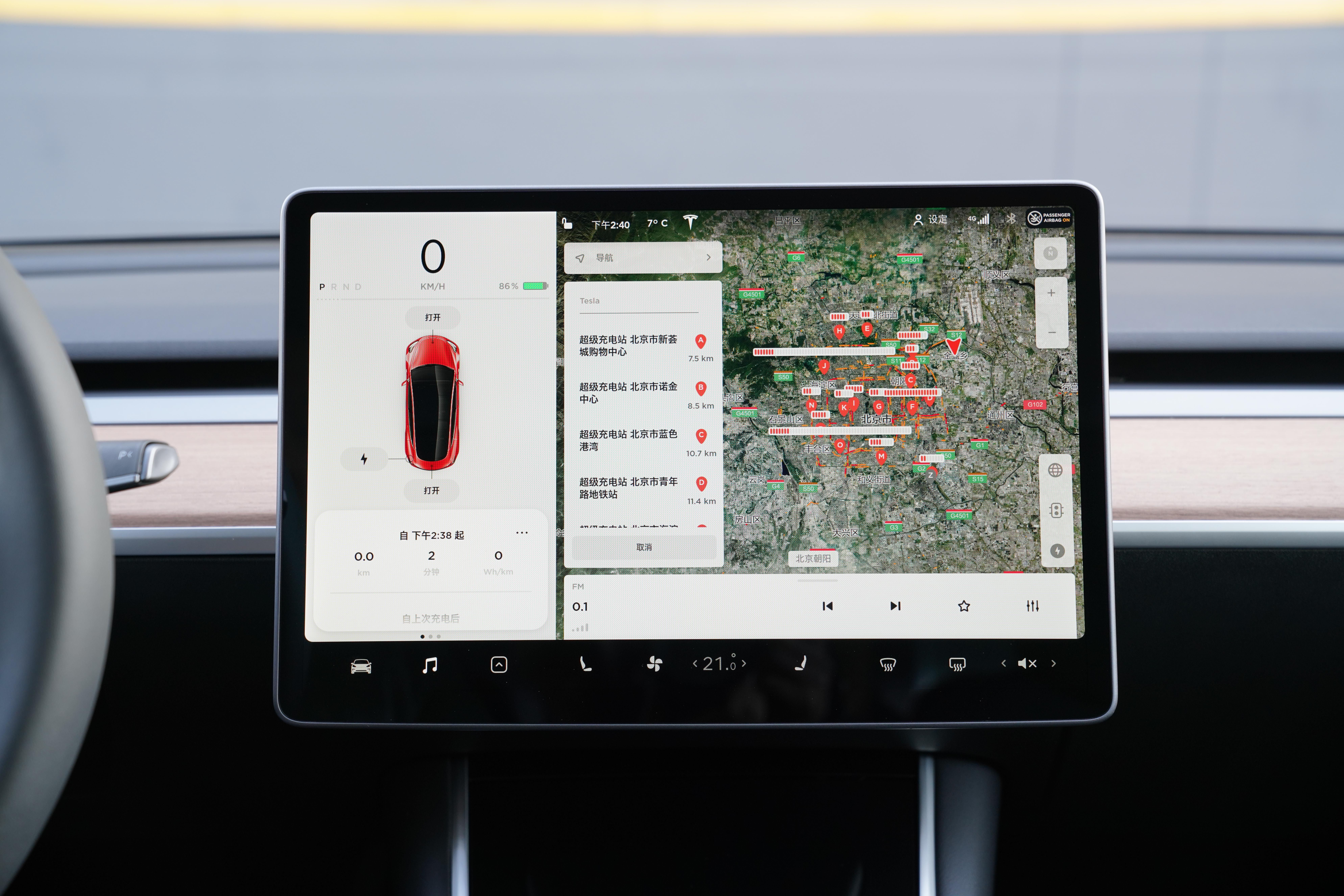 这次的Model 3的设计中最大的设计理念就是尽量的抛弃物理按键,后视镜调节,转向柱调节,大灯调节等功能全都集成在屏幕之中,我们实际体验了转向柱与后视镜调节的操作,在车辆控制的默认界面-快速控制中便可找到,点击功能按键后,通过与方向盘左侧的控制按钮相配合,实现调节功能。操作的步骤均为3步。在车辆静止状况下调节,感受良好;若是车辆行进过程中,则步骤略显繁琐,需要耗费驾驶员大量的精力。