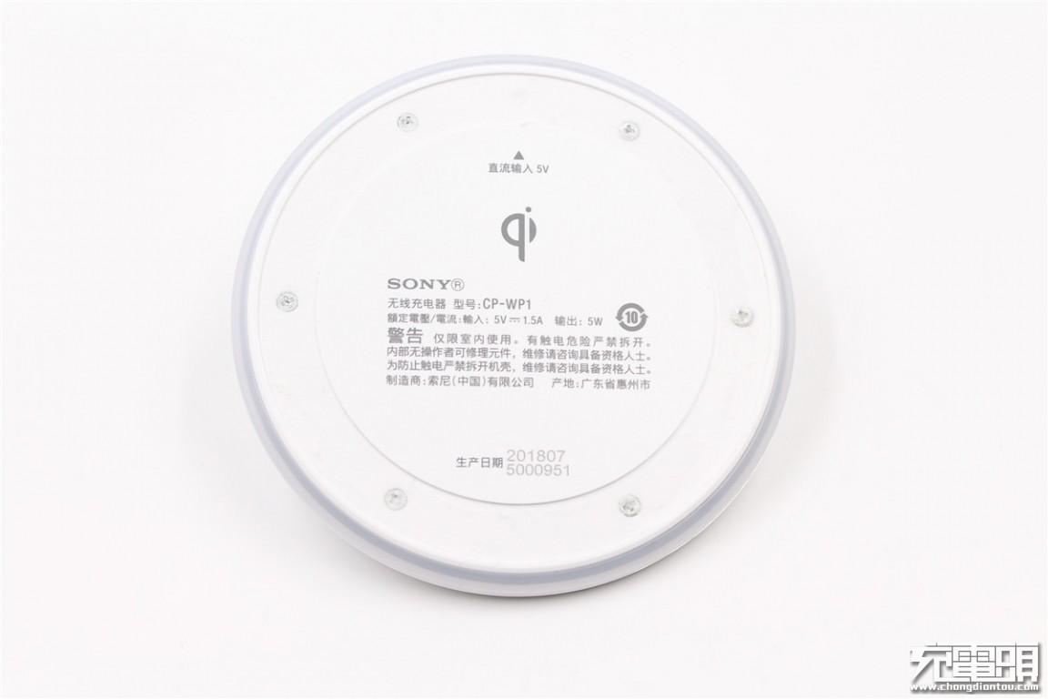 背面四周有一圈防滑胶垫,中间为产品主要规格参数,上方有一个“Qi”Logo。产品名称:SONY无线充电器;型号:CP-WP1;输入:5V1.5A;输出:5W;制造商:索尼(中国)有限公司;产地:广东深惠州市。