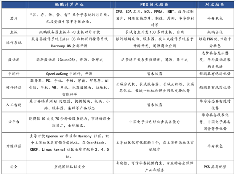 对比鲲鹏与飞腾的生态构建,可以发现,鲲鹏技术路线比PKS路线有较明显的技术和产品优势,PKS技术路线比鲲鹏技术路线有较明显的安全优势。