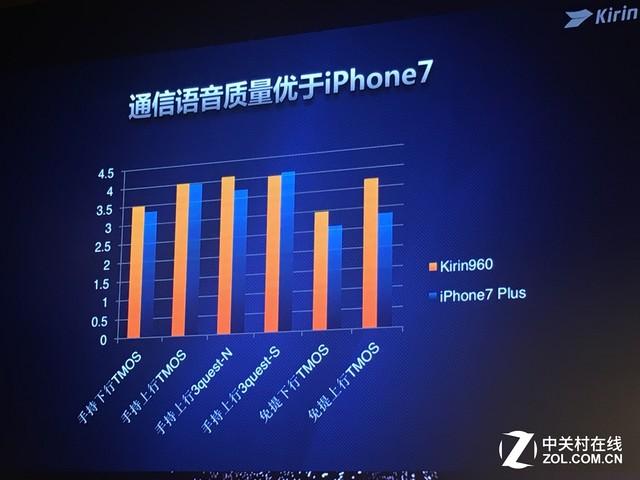 在语音质量对比测试中,麒麟960(测试样机)手持上行、下行以及免提上行、下行多项指标都超过iPhone7。相比VoLTE标准,频谱范围扩展100%、采样率提升100%,华为称之为“HD Voice+”。音频播放方面,麒麟960(测试样机)支持播放192bit/24Hz Hi-Fi音质,在多项对比测试中,都要超过iPhone7。
