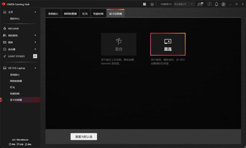 显卡直连也是VICTUS光影精灵9的标配,所有配置版本均能实现显卡直连、混连切换,无需关机重启。