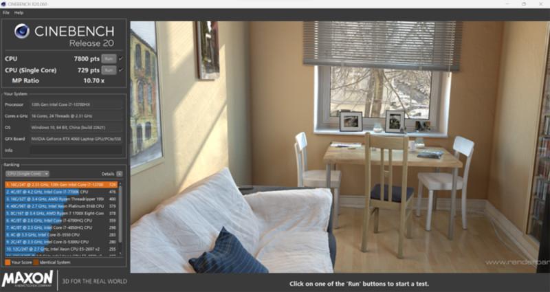 Cinebench R20,单线程分数为729pts,多线程分数为7800pts。