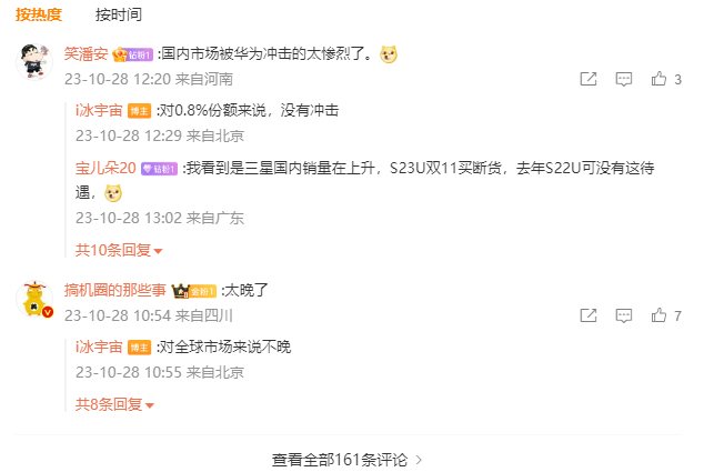 @i 冰宇宙还在和网友的互动中,调侃了三星国内市场份额。有网友表示:“国内市场被华为冲击得太惨烈了”,而 @i 冰宇宙调侃道:“对 0.8% 份额来说,没有冲击”。