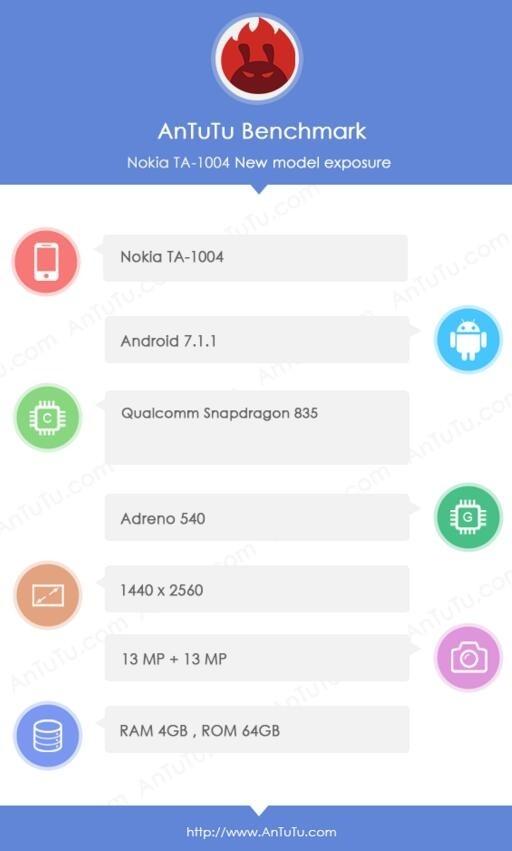 目前跑分软件安兔兔评测数据库发现了一款疑似Nokia 9的诺基亚新款手机,其型号是:TA-1004。代号为TA-1004的手机搭载了骁龙835处理器,GPU为Adreno 540,屏幕为2K屏分辨率为1440X2560,摄像头为1300万像素和1300万像素,4GB 运存和64GB 机身存储,除了内存稍小以外,Nokia 9的配置也是当前主流手机的配置。