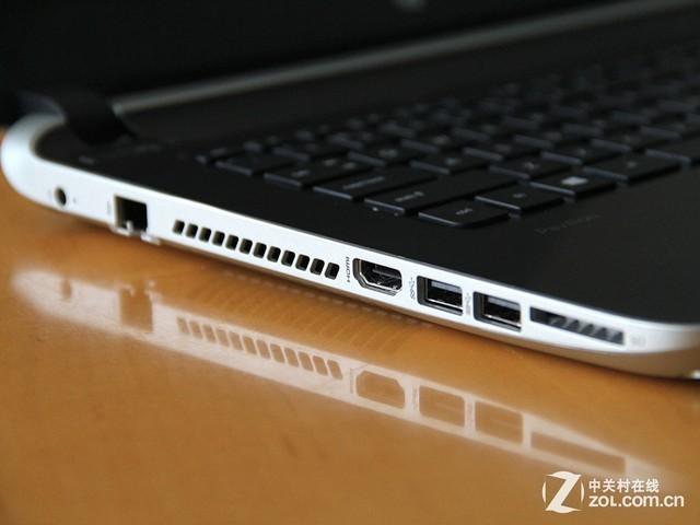 在新Pavilion 14机身两侧,配置了各种常用的接口。我们从机身左侧可以看到一个电源接口及电源指示灯、一个RJ-45接口、散热出风口、一个HDMI接口、两个USB3.0接口以及一个多合一读卡器。