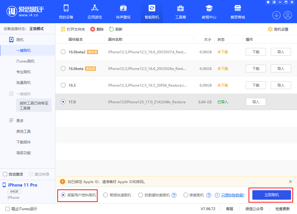 3.如果你不希望设备资料被清空,请勾选“保留用户资料刷机”选项,然后点击“立即刷机”。