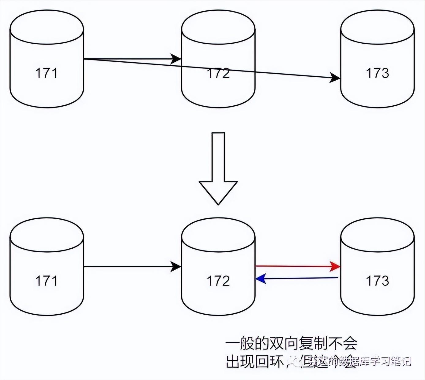 当服务器 171 生成了一个二进制日志事件(binlog event),这个事件被标记为 server_id 为 171。然后,这个事件被复制到了服务器 172,因为服务器 172 的 server_id 与事件的 server_id 不同,所以它接受了这个事件。然后,服务器 172 将这个事件传递给了服务器 173,服务器 173 也接受了这个事件,因为它的 server_id 与事件的 server_id 不同。