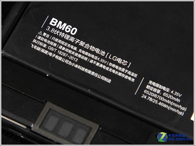 电池的部分是粘在机身主框架上面的,小米平板用的是LG的锂聚合物电芯,容量为6520mAh,基本与苹果的iPadmini2持平(6430mAh),远高于谷歌的Nexus 7 二代和亚马逊的KindleHDX 7。