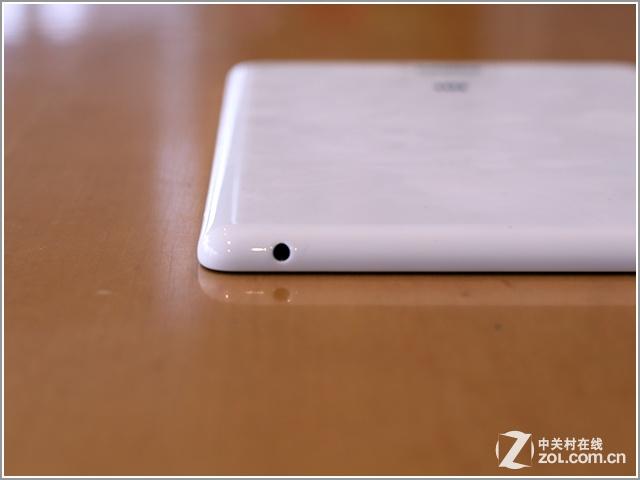 总体来讲,小米平板的细节逐一设计都在保证机身的完整性。机身顶部是3.5mm的耳机插孔,底部则为MicroUSB数据插孔。机身前置摄像头在屏幕正上方的中间位置,后置摄像头采用的是800万像素索尼背照式相机光圈为F2.0级别。此外,值得注意的是,在背部摄像头旁边和机身背面顶部正中间的位置有两个类似MIC的开孔,我们猜测这有可能是麦克风和降噪麦克风的开孔。最后,屏幕下方的功能按键带背光,在户外强光下效果较为明显。