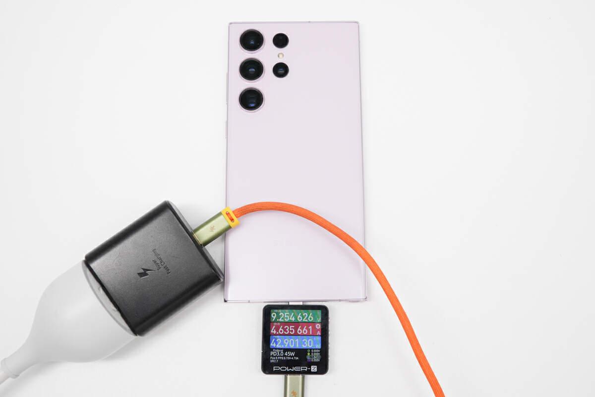 使用原厂65W充电器(型号:EP-T6530)搭配三方 240W 充电线为三星 Galaxy S23 Ultra充电,使用 POWER-Z KM003C 实测充电器输出端功率为 9.38V 4.62A 43.36W;实测充电功率除充电器的最高功率因素外,手机的原装充电线材的限制因素关联更大。
