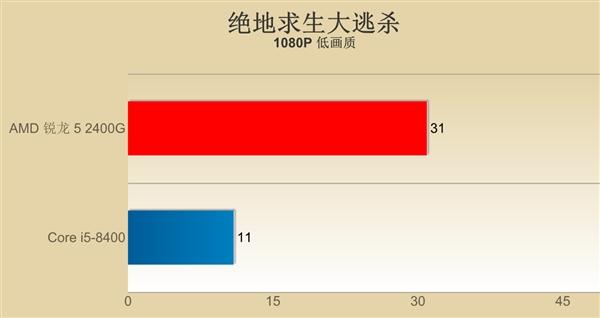 首先是低画质。在开始出生情况下,锐龙5 2400G能提供高于30fps的平均帧速,Intel酷睿i5-8400则只有12FPS。