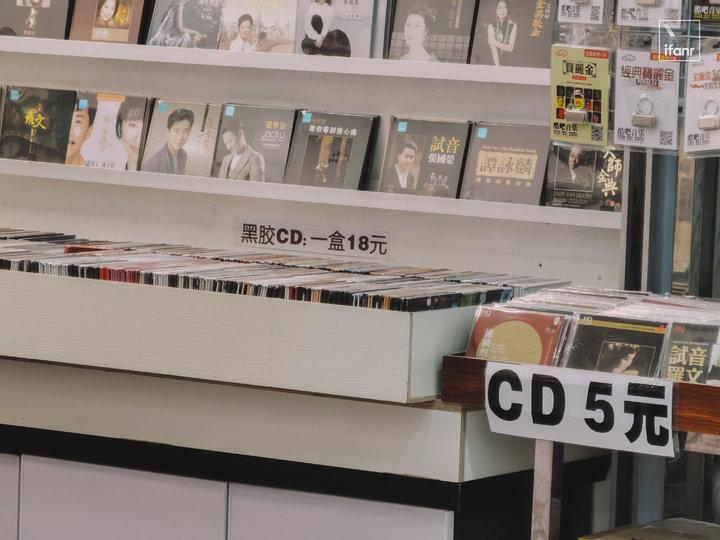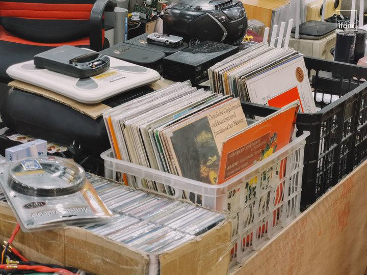 一箩箩的旧黑胶唱片和唱片机在这里陈列着,大多数都是 90 年代港台明星的唱片,包装也大概有 8-9 成新,每张从数十到上百元不等,主要是看唱片的成色和受欢迎程度来定。