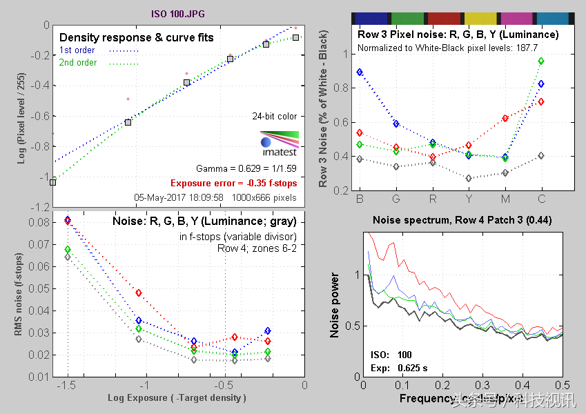 ISO 100的最高噪点值为0.08左右,属正常情况。从Row 3 noise:R,G,B,Y (Luminance)图表中可以看到,在蓝色上是以蓝色通道的噪点为最多,达到0.9左右。红色上是以红色通道的噪点最多,达到0.5左右。绿色的噪点最高值出现在红色通道上,达到0.5左右。在低感方面,索尼一向是做得很好,这次索尼微单™A6500同样也不例外,低感光度表现非常好。