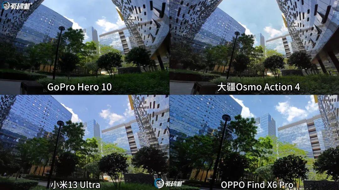 Osmo Action 4的白平衡和测光都还OK,特别是夜景/弱光场景的测光,非常接近肉眼所见。白天细节最强的,是小视野IMX890的Find X6 Pro,其次是有5.3K录像的GoPro Hero 10。小米13 Ultra和视野巨大的Osmo Action 4,细节就明显要弱1、2个档位。Osmo Action 4边缘画质劣化不明显,边缘可以反超GoPro Hero 10。