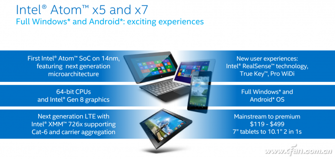 Cherry Trail-T是基于14nm工艺打造的超低功耗平台,包含Atom X5和X7两大产品线,涉及到Atom X5-Z8300/Z8350、Atom X5-Z8500/Z8550、Atom X7-Z8700/Z8750等具体型号。其中,Atom X5的集成GPU拥有12个EU计算单元,而Atom X7的GPU则集成了16个EU计算单元。所以,该平台高端处理器除了主频高(CPU性能更好)以外,GPU图形性能也更具优势。