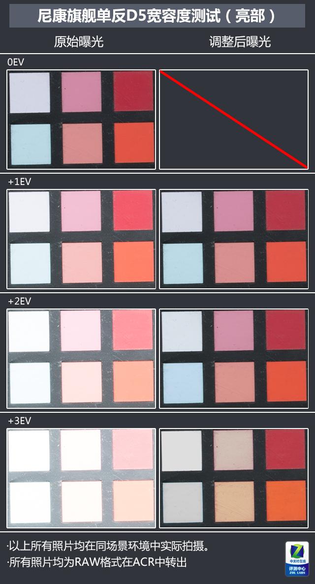 亮部(过曝处理),受限于电子传感器本身的特性,显然过曝方面的表现很难和欠曝部分相媲美。相机可以保证在过曝+2EV的情况下,确保画面内容亮部暗部均能在后期调整后保持细节记录。在+3EV过曝时,照片亮部的一些部分就会出现超出记录范围的而失去照片内容的状况。鉴于D5在+2EV下的表现,其过曝下的宽容度表现还是较为让人满意的。总的来看,尼康D5的宽容度使用范围基本在-5EV到+2EV的范围内。正负共7EV的表现还是较为满意的。当然了,这一表现显然不能和主打高画质的D810之类的低感画质优势机型相比,宽容度方面不算是D5的优势,其画质方面的性能优势主要是在高感方面。