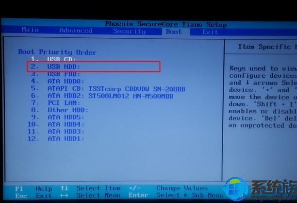 2、按→方向键切换到Boot,选择U盘启动项,一般为USB HDD,同时按住“Shift和+”移动到第一的位置;