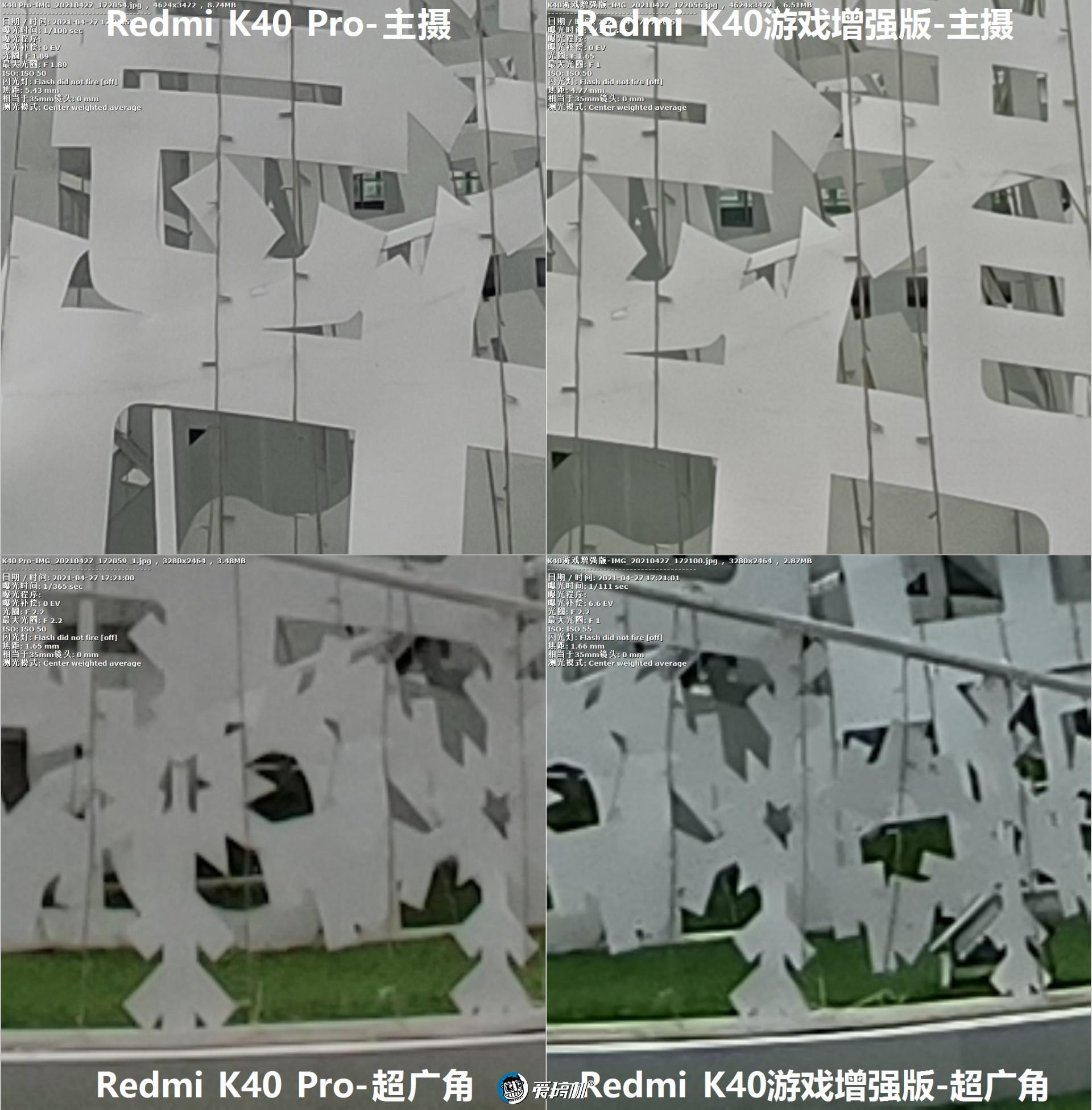 K40游戏增强版主摄是6400W的OV64B,0.7μm,1/2",卖点是“1玻璃+5塑料”的镜头,做到了更大的F1.65光圈。规格强于K40的IM582(4800W,1/2''),弱于K40 Pro的IMX686(6400W,1/1.7″,0.8μm)。超广角还是万年F2.2光圈的800万像素IMX355。很好玩的500W长焦微距变成战术性质的200W微距,很可惜,但无可奈何。和K40的方案比的话,我宁愿K40游戏增强版这套。这里就直接和高半阶的K40 Pro比一下: